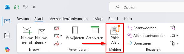 Met deze knop kunnen gebruikers eenvoudig phishingmailtjes melden. In geval van een phishingsimulatie krijgen gebruikers een melding dat het om een test gaat. In andere gevallen wordt deze doorgestuurd naar een aparte mailbox zodat het bericht kan worden gecontroleerd.